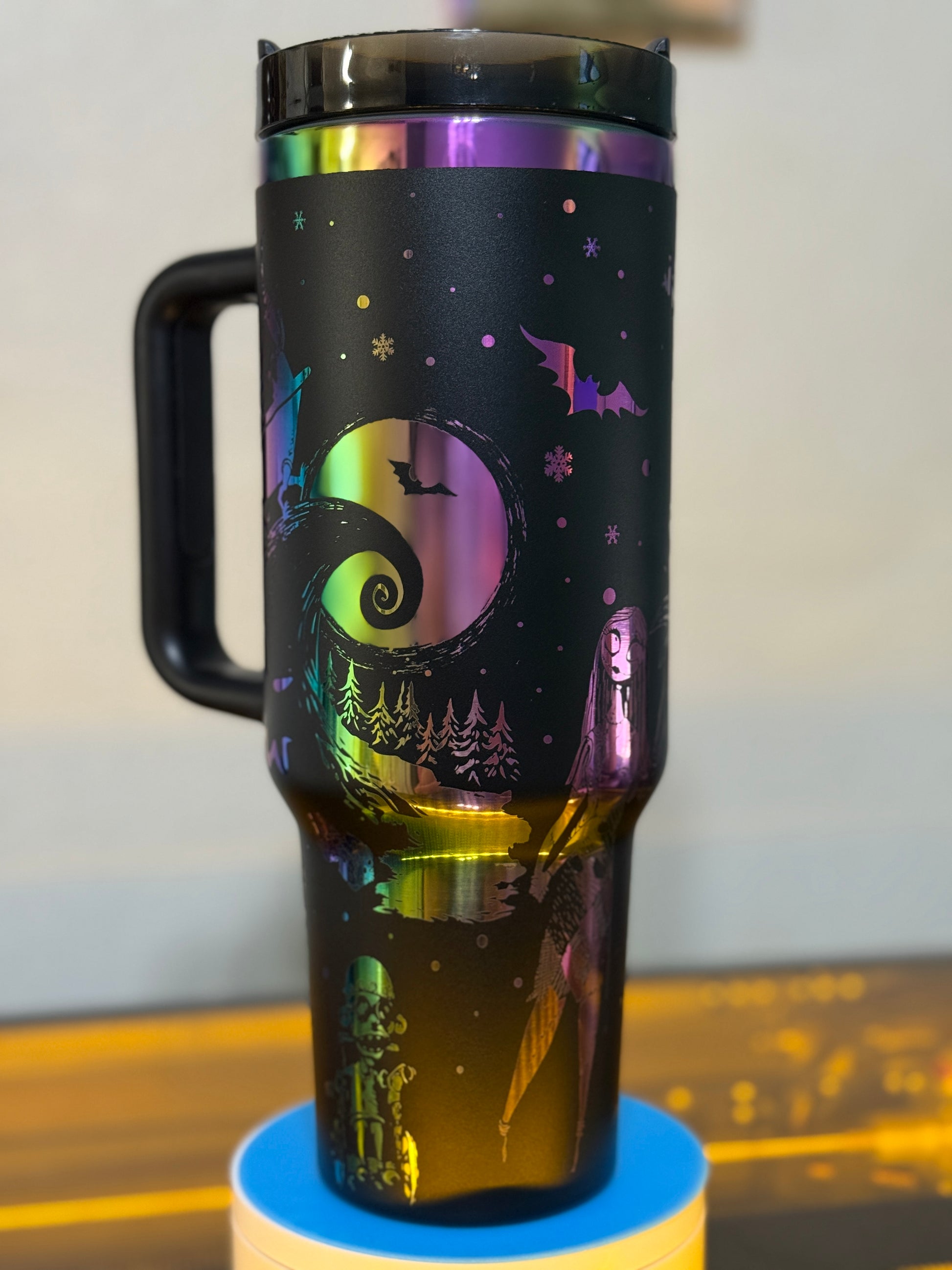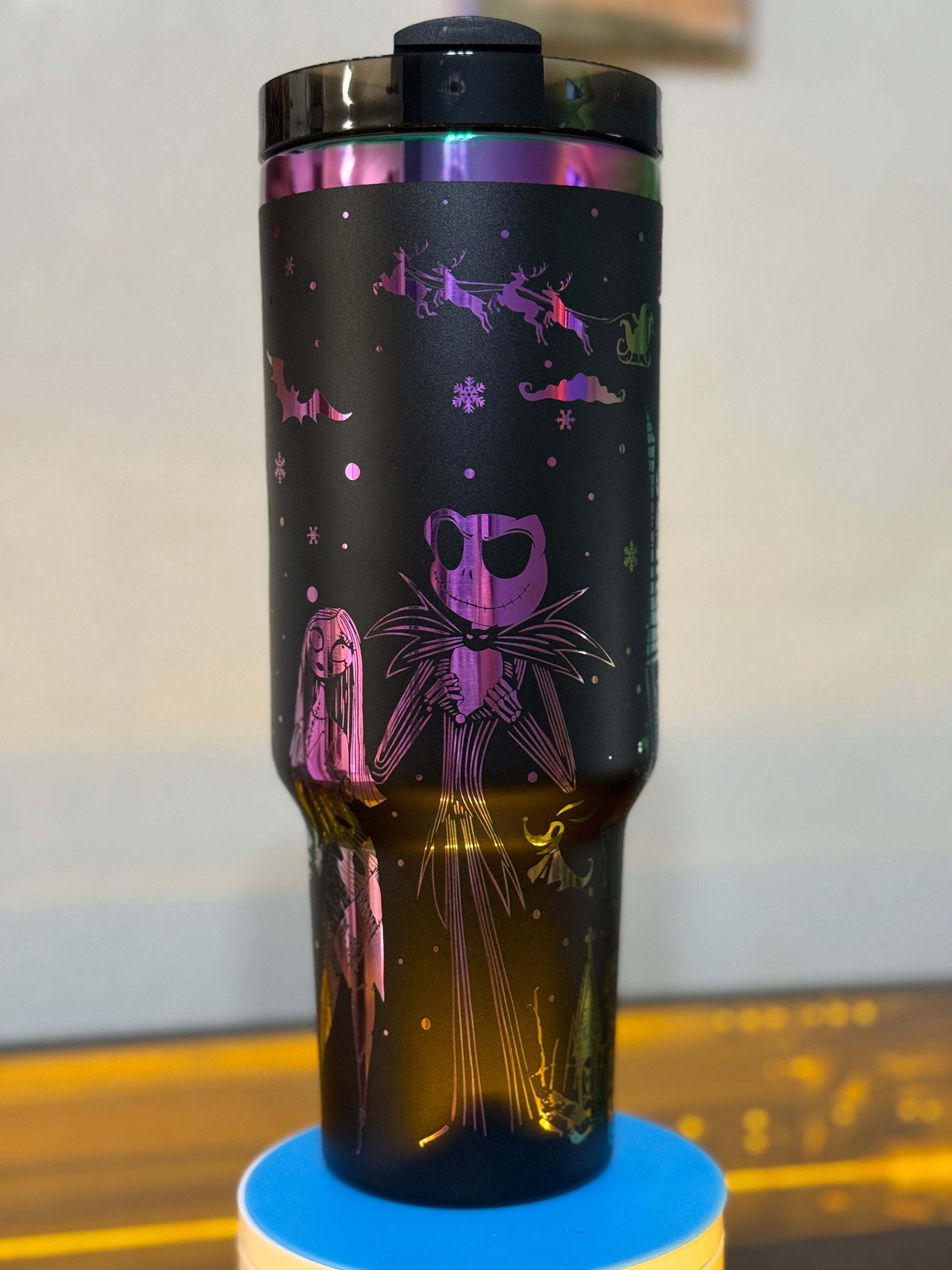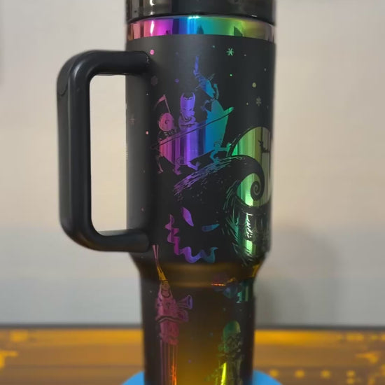 Meet your new favorite cup: a 40oz black-and-rainbow stainless steel tumbler, perfectly engraved with a Nightmare Before Christmas design that’s ready to follow you from Halloween Town to Christmas Town (and every coffee run in between).