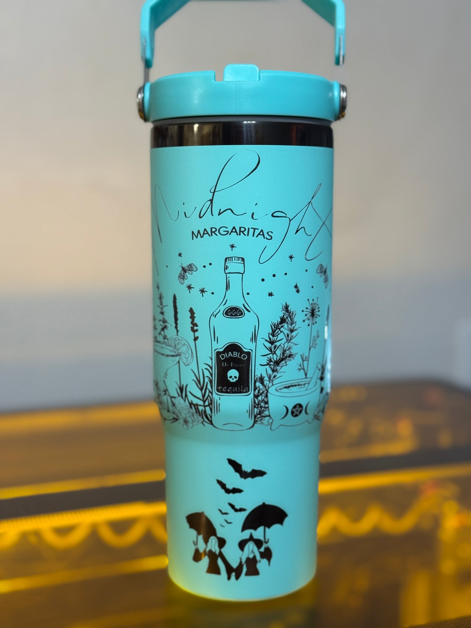 Practical Magic Midnight Margaritas Tumbler – 30oz Stainless Steel Cup | Turquoise & Black Engraved Witchy Drinkware