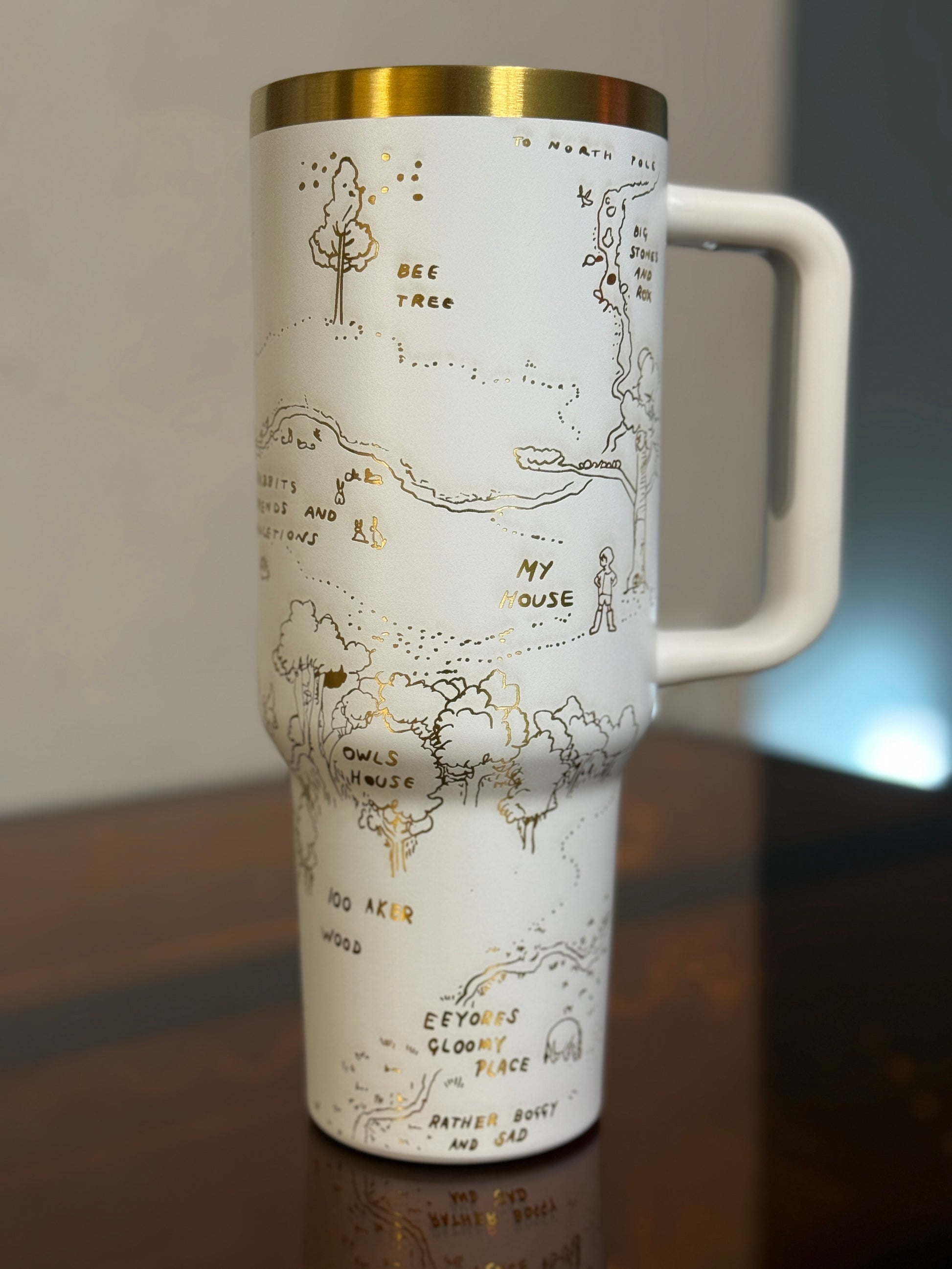 Winnie the Pooh Tumbler – 40oz Stainless Steel Travel Mug | Hundred Acre Wood Engraved Cup | White & Gold Tumbler